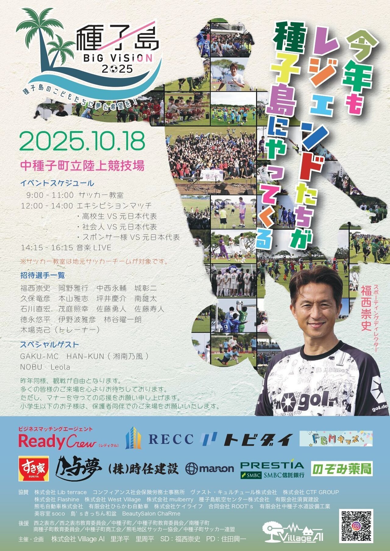 Leola 2025.09.10 【Leola】10/18(土)開催『種子島 BiG ViSiON 2025』参加決定! 10/18(土)に中種子町立陸上競技場にて開催される、『種子島 BiG ViSiON 2025』にスペシャルゲストとしてLeolaの参加が決定しました! 是非、チェックしてください! 『種子島 BiG ViSiON 2025』 【日時】 2025/10/18(土) 9:00〜11:00 サッカー教室 12:00〜14:00 エキシビションマッチ 14:15〜16:15 音楽LIVE 【会場】 中種子町立陸上競技場
