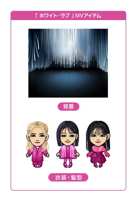 マイページ 2023.01.26 【LDH Girls mobileマイページ】iScream「ホワイト・ラブ」MVアイテム配信!! LDH Girls mobileマイページでは、iScream「ホワイト・ラブ」のMVアイテムを配信します!! ぜひアイテムをGETして、着せ替えを楽しみましょう♪ ※iScream「ホワイト・ラブ」髪型は、iScreamのそれぞれのメンバーのアバターのみ着用可能です。