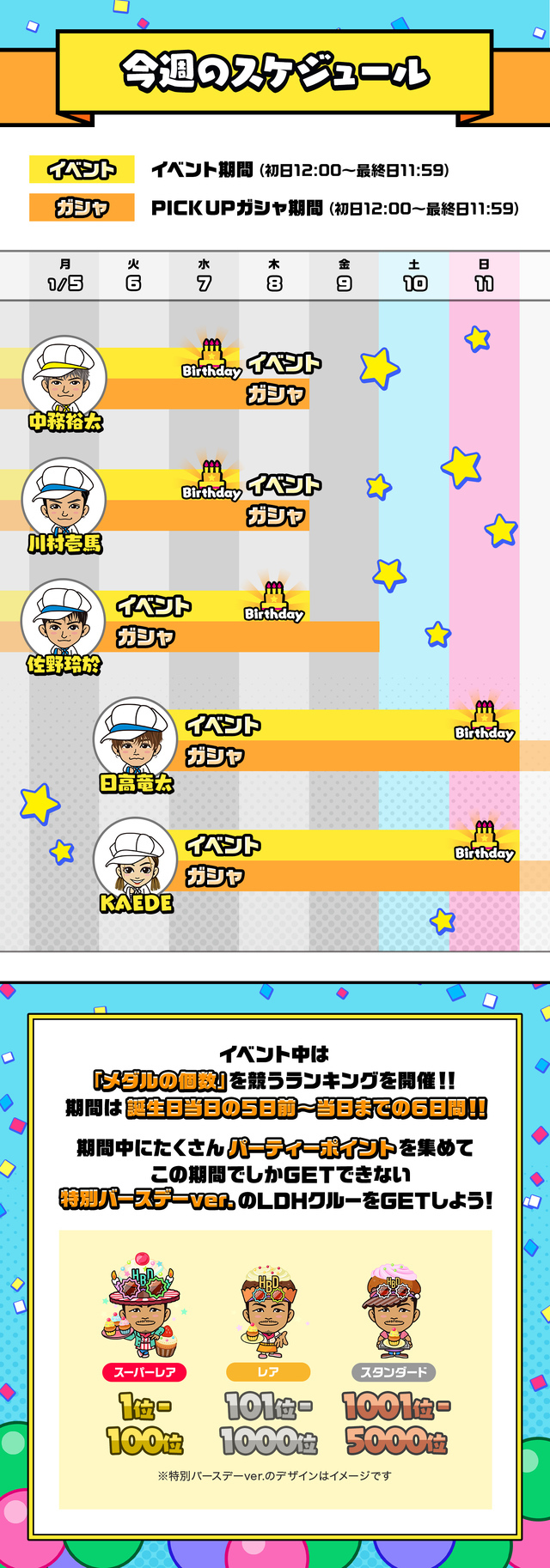 マイページ 2026.01.05 【LDH Girls mobileマイページ】 MEMBER BIRTHDAY PARTY 今週のイベントラインナップ ※オリジナル画像は、メンバーのバースデー前日の12:00から当日の11:59までダウンロードすることができます。