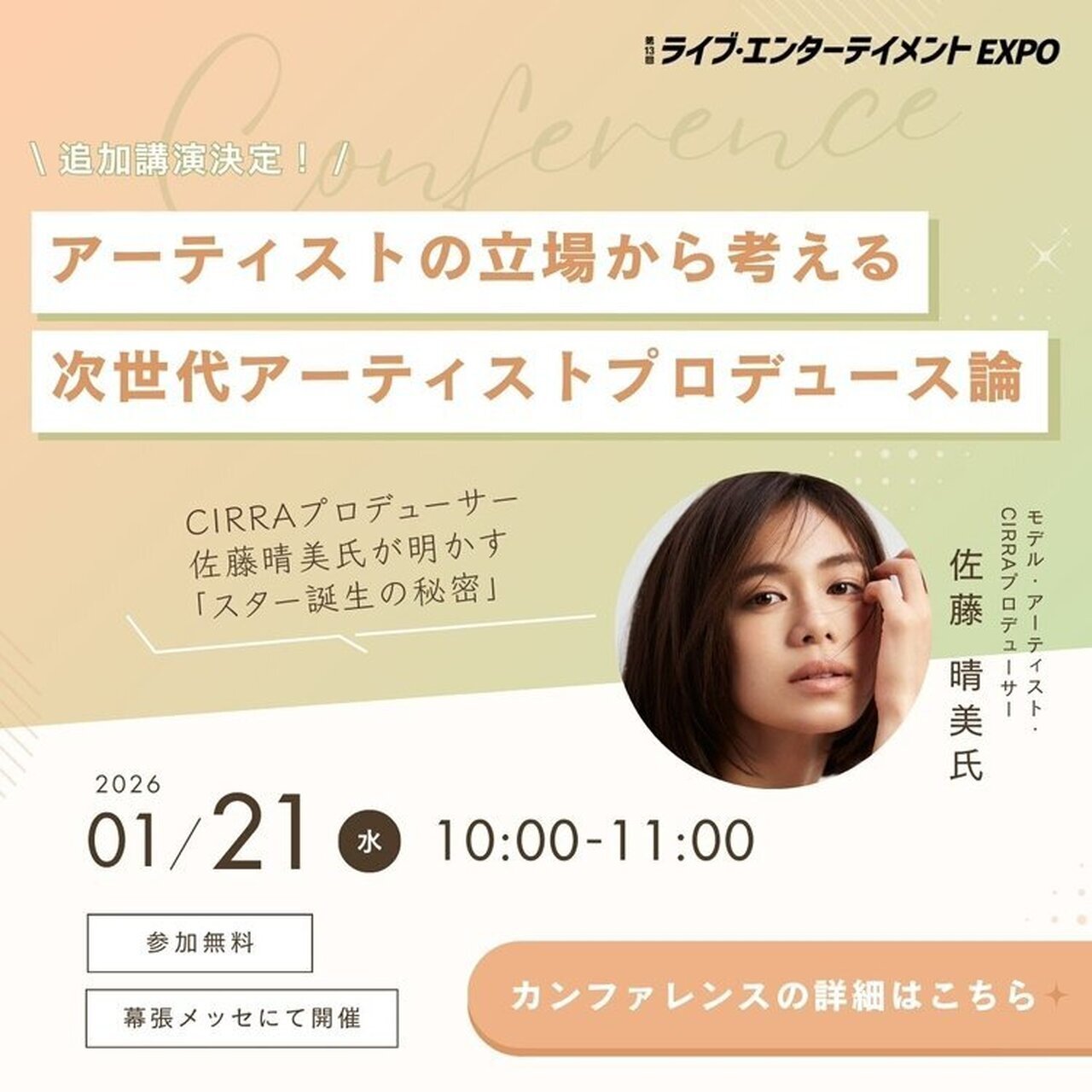 佐藤晴美 2026.01.19 NEW 【佐藤晴美】1/21(水)開催『ライブ・エンターテイメントEXPO』にて講演を実施! 1/21(水)に幕張メッセにて開催される、『ライブ・エンターテイメントEXPO』にて佐藤晴美が講演を実施します! 本講演は、事前申込制となります。 是非チェックしてください! 『ライブ・エンターテイメントEXPO』 【日時】 2026/1/21(水) 【会場】 幕張メッセ お申し込みはこちら