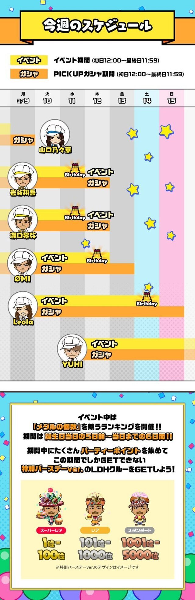 マイページ 2026.03.09 NEW 【LDH Girls mobileマイページ】 MEMBER BIRTHDAY PARTY 今週のイベントラインナップ ※オリジナル画像は、メンバーのバースデー前日の12:00から当日の11:59までダウンロードすることができます。