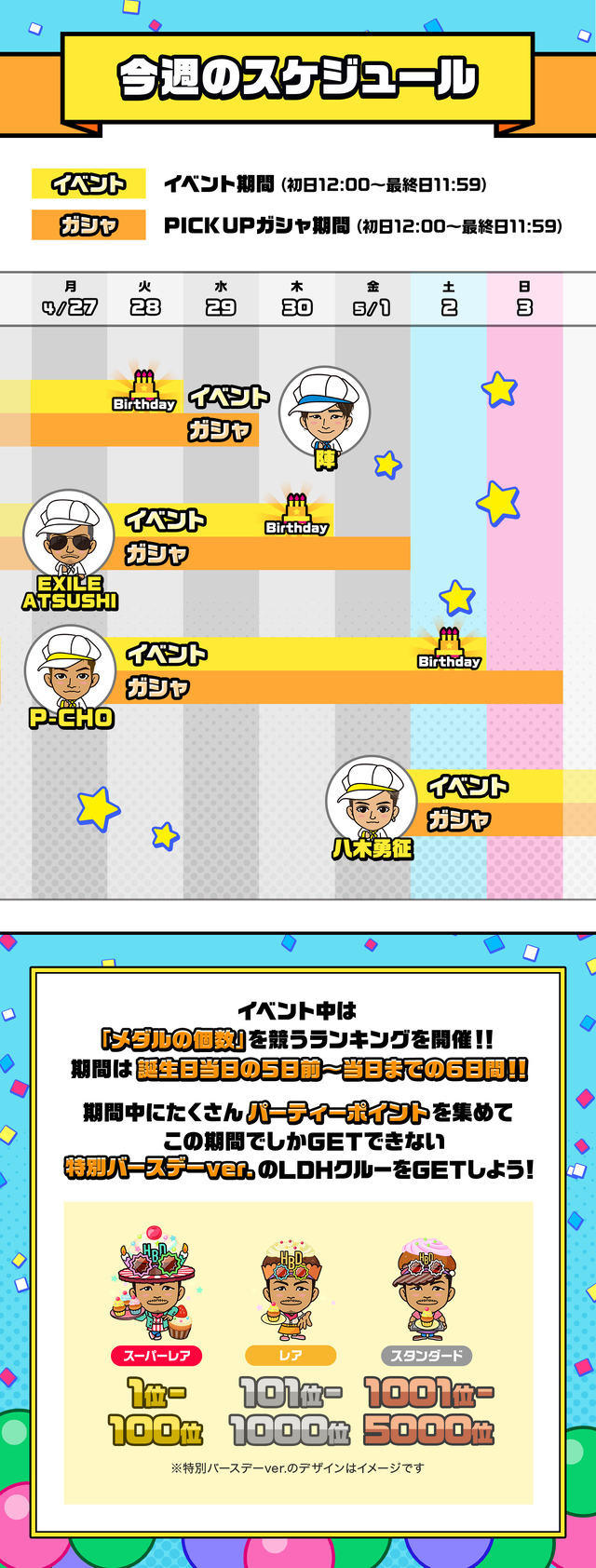 マイページ 2026.04.27 NEW 【LDH Girls mobileマイページ】 MEMBER BIRTHDAY PARTY 今週のイベントラインナップ ※オリジナル画像は、メンバーのバースデー前日の12:00から当日の11:59までダウンロードすることができます。