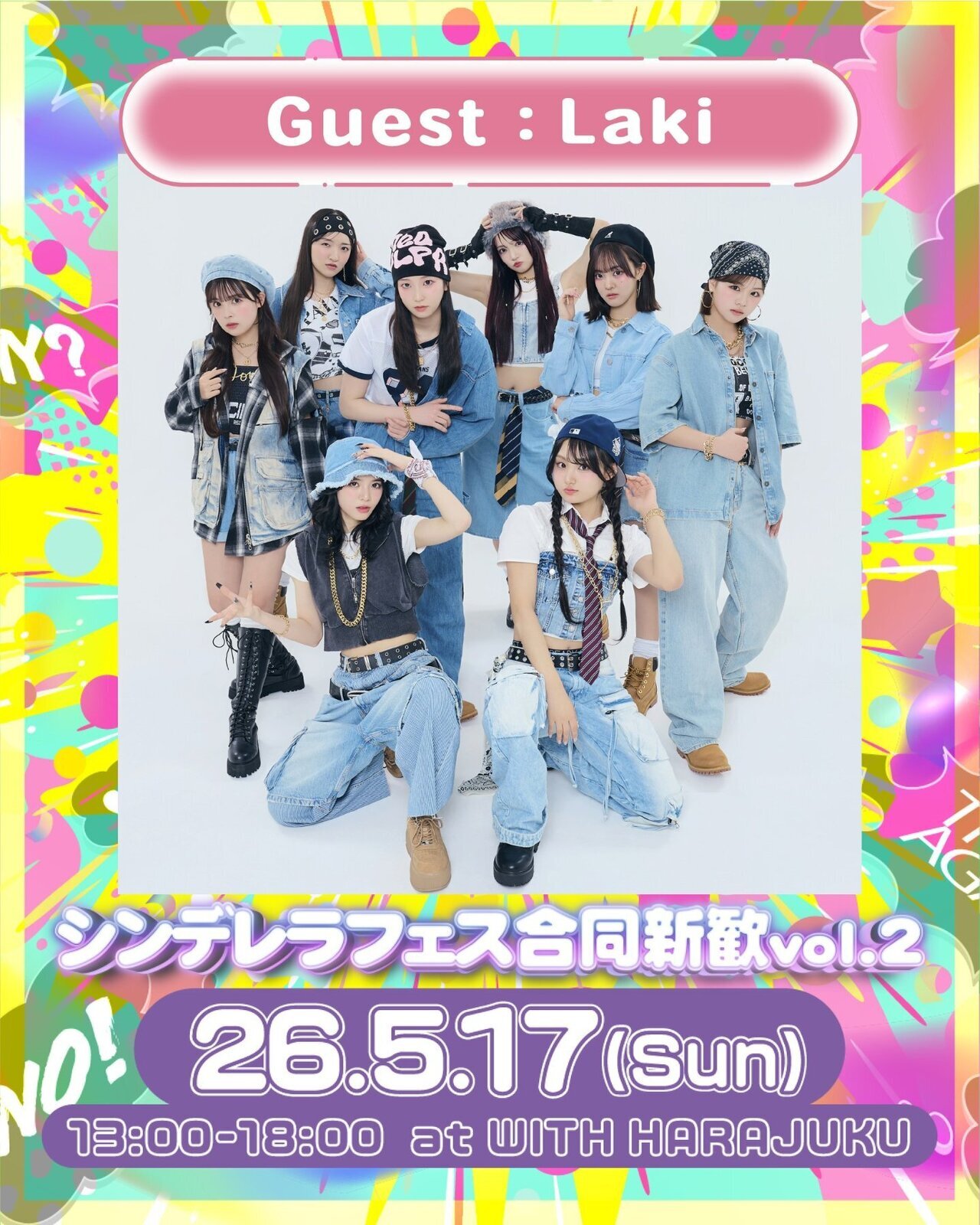 Laki 2026.04.23 NEW 【Laki】5/17(日)開催『シンデレラフェス合同新歓vol.2』に出演! 5/17(日)にWITH HARAJUKU HALLで開催される、『シンデレラフェス合同新歓vol.2』にLakiの出演が決定しました! 当日のパフォーマンスをお楽しみに!! 是非チェックしてください! 『シンデレラフェス合同新歓vol.2』 【日程】 2026/5/17(日)13:00〜18:00 【会場】 WITH HARAJUKU HALL ※来場対象15歳〜22歳の女子限定 ※入場料:無料 ※事前予約が必須です。